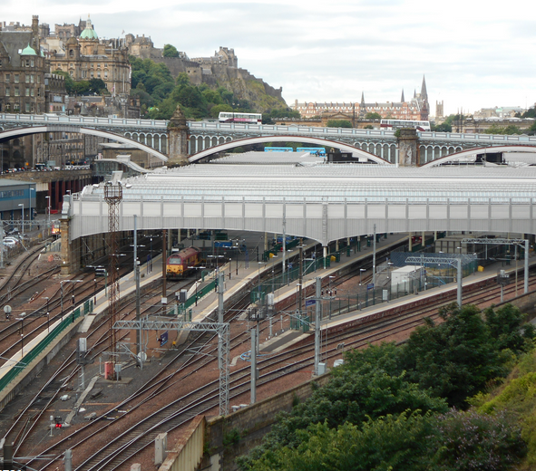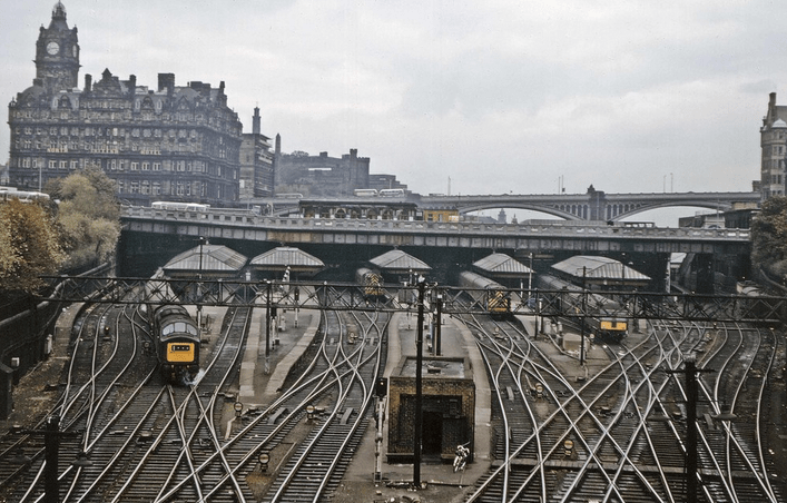 The Station is Edinburgh Waverley in the days when it was open plan. The platform is one of the West bound double ones.